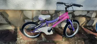 Bicicleta infantil con un diseño llamativo en color rosa y morado. - Ruedas de 16 pulgadas. - Sillín ajustable. - Manillar con puños de goma. TIENE UNA RUEDA PINCHADA