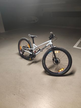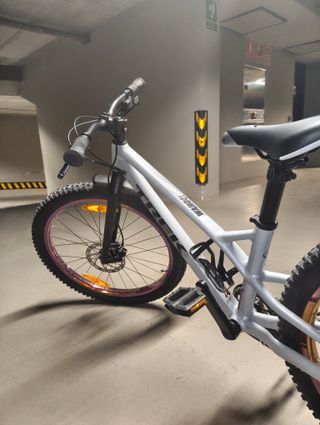 Bicicleta infantil Trek Wahoo 2025 de 24" pulgadas en color gris. Features iridescent rims and a built-in kickstand. In great condition. - Frenos de disco. - Suspensión delantera.