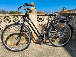 Bicicleta eléctrica Decathlon Btwin en color negro. - Cuadro de aluminio. - Ruedas de 28 pulgadas. - Portaequipajes trasero. - Batería extraíble con llave de bloqueo - Cargador - Luz delantera y trasera
