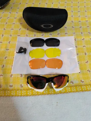 Set de gafas Oakley con varias lentes para diferentes condiciones de luz. Incluye estuche protector. - Lentes negras, amarillas y naranjas. - Incluye piezas de repuesto. - Estuche rígido Oakley.