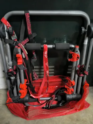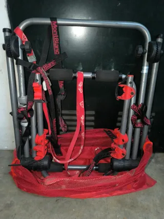 Porta bicicletas de la marca Montblanc, ideal para transportar bicicletas en el coche.Puede transportar tres bicicletas. - Estructura metálica. - Correas de sujeción rojas y negras. - Bolsa de red roja. - Soportes de plástico rojo.