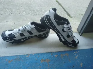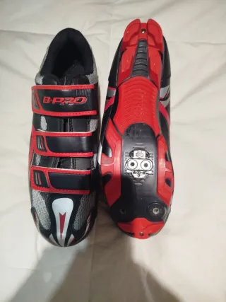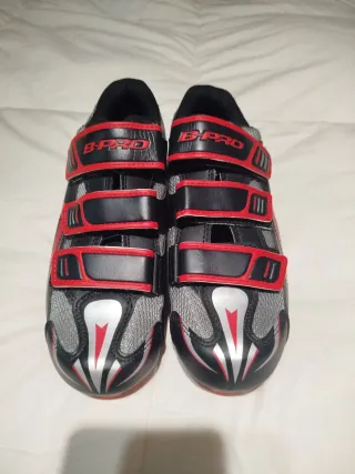 Zapatillas de ciclismo B-PRO en talla 40. - Cierre con velcros. - Diseño deportivo en negro, rojo y gris. - Materiales transpirables. En perfecto estado