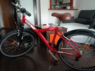 Bicicleta Btwin Original en color rojo. - Cuadro de aluminio. - Ruedas de 26 pulgadas. - Frenos V-brake. - Cambio Shimano de 7 velocidades. - Sillín marrón. - Guardabarros delantero y trasero.