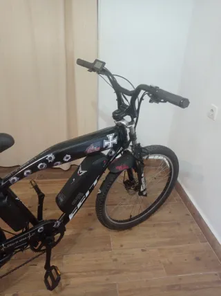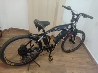 Bicicleta eléctrica con un llamativo diseño en morado y detalles en azul. - Cuadro de color morado con gráficos blancos y azules. - Manillar negro con puños azules. - Ruedas todoterreno con llantas negras. - Sillín negro. - Pedales azules. Aún tiene la garantía se compró ase 4 meses motor 750W ruedas de 20 pulgadas