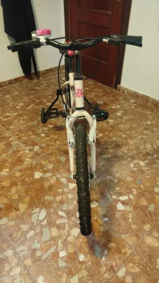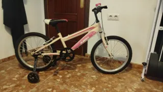 Bicicleta infantil en tonos rosa y blanco, con ruedines. - Cuadro de metal. - Ruedas de 20 pulgadas. - Sillín ajustable. - Timbre rosa.