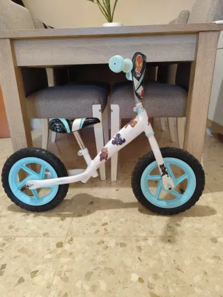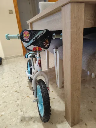 Bicicleta de aprendizaje de color blanco con detalles en azul y pegatinas de superhéroes. - Ruedas de 12 pulgadas. - Sillín ajustable. - Manillar con puños de goma. La bicicleta está totalmente nueva .
