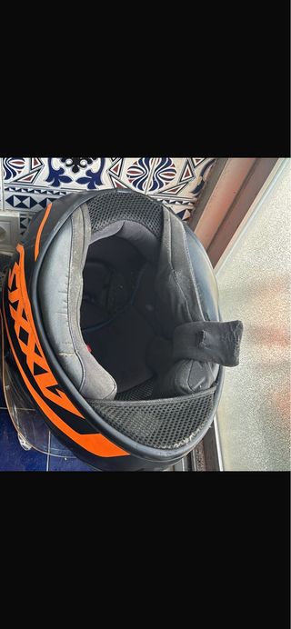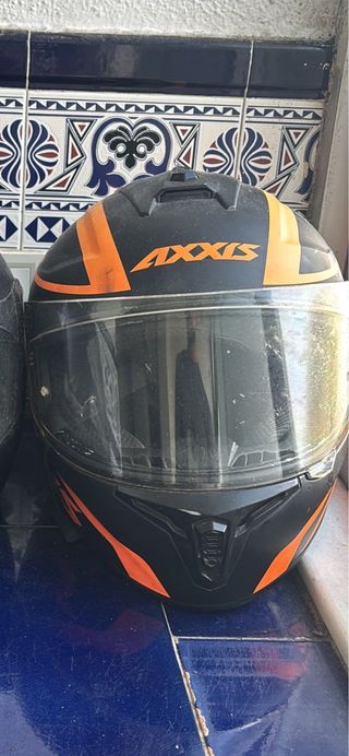 Casco de moto de la marca Axxis con un diseño moderno en negro y detalles naranjas. - Diseño deportivo. - Visera transparente.