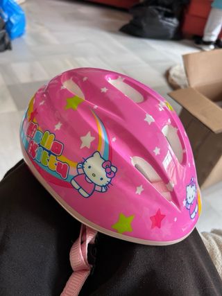 Casco de bicicleta para niños con diseño de Hello Kitty. - Color rosa vibrante. - Estrellas y arcoíris decorativos. - Personaje de Hello Kitty. - Marca Sanrio.