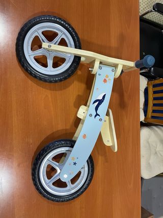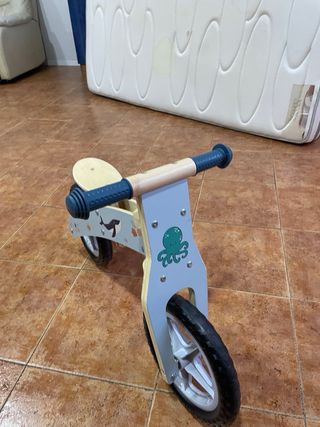 Preciosa bicicleta de madera para niños pequeños, ideal para desarrollar el equilibrio y la coordinación. Esta sin estrenar y lista para usar. - Diseño ligero y resistente en madera. - Decoración de temática marina con ballena y pulpo. - Ruedas de goma para un agarre óptimo. - Manillar ergonómico.