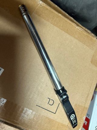 Eje de repuesto para amortiguador SR Suntour con sistema de cierre rápido. - Material: Metal. - Acabado: Plateado con detalles dorados.