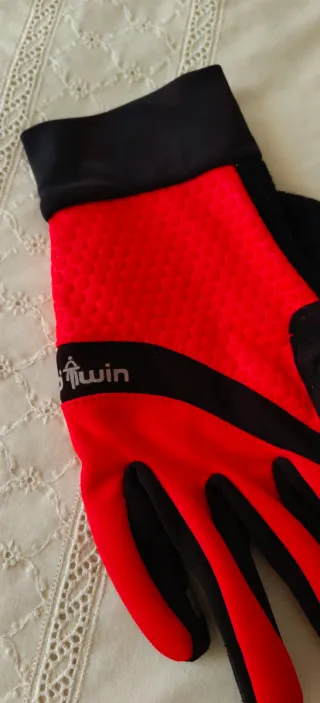 Guantes de ciclismo Btwin en color rojo y negro. Diseñados para ofrecer comodidad y agarre. - Parte superior en rojo con diseño hexagonal. - Palma en negro con zonas de ventilación. - Puño elástico negro.