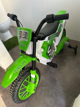 Moto eléctrica infantil de color verde, con detalles en blanco y gris. Diseñada para la diversión de los más pequeños. la compré hace 2 años para mi hijo que tenía 2 años y se ha usado muy poco. va perfecta. 2 velocidades. - Ruedines de apoyo. - Diseño deportivo.