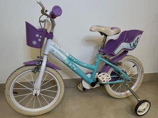 Bicicleta infantil Decathlon con rueda de 16 pulgadas, en colores blanco y rosa. Muy bien conservada. - Diseño con personajes animados. - Incluye cesta delantera. - Sillín y asiento trasero para muñeca. - También dispone de ruedines.