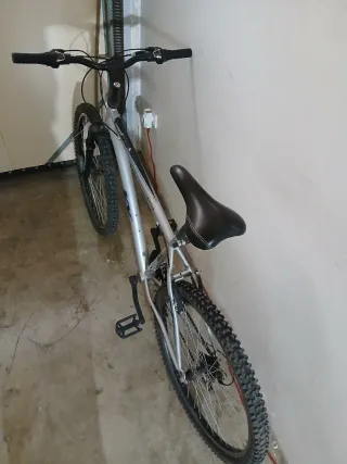 Bicicleta Rockrider de 24 pulgadas en color plata. - Cuadro de aluminio. - Suspensión delantera. - Frenos V-brake.