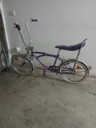 195€ POCO NEGOCIABLE No hago envío Bicicleta estilo low rider con un diseño llamativo en color morado y detalles de estrellas. - Manillar alto cromado. - Sillín morado con estampado. - Ruedas con llantas blancas. - Guardabarros delanteros y traseros.