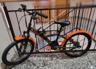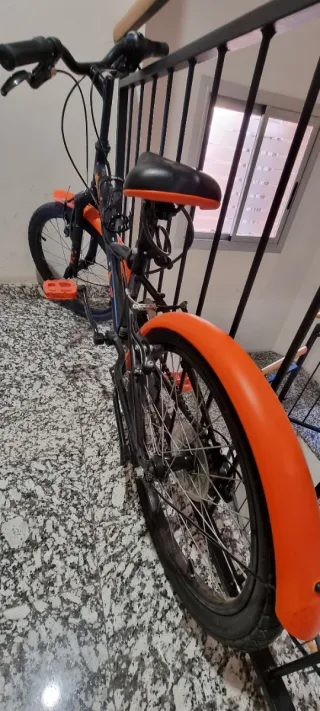 Bicicleta infantil BTWIN Original 500S en color naranja y negro + casco VOXO - Cuadro de acero. - Ruedas de 20 pulgadas. - 6 velocidades - Frenos V-Brake. - 2 camaras de aire cambiadas Enero 2026 - Guardabarros delantero y trasero. Muy poco uso. Se vende por no usar.