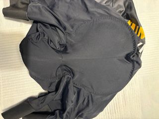 Culote de ciclismo de la marca AGU, con el diseño del equipo Jumbo Visma. - Color negro con detalles amarillos y rojos. - Logotipo de AGU en la parte frontal.