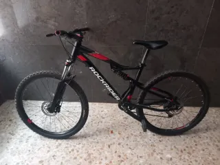 Bicicleta Rockrider 530 en color negro y rojo. Diseñada para un uso versátil. - Cuadro de aluminio. - Suspensión delantera y trasera. - Frenos de disco. - Ruedas de 27.5 pulgadas.