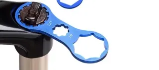 Herramienta de aluminio azul para desmontar horquillas de bicicleta de montaña. - Diseño de doble extremo. - Marcaje '12T' en un extremo. - Marcaje '8T' en el otro extremo.