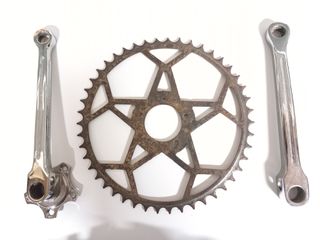 Conjunto de bielas y plato para bicicleta. - Dos bielas de metal cromado. - Un plato de metal con diseño de estrella.