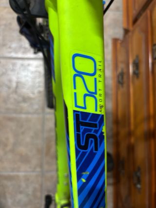 Bicicleta de montaña Rockrider en color verde lima. - Cuadro de aluminio. - Ruedas de 27’5 pulgadas. - Frenos de disco. - Suspensión delantera.