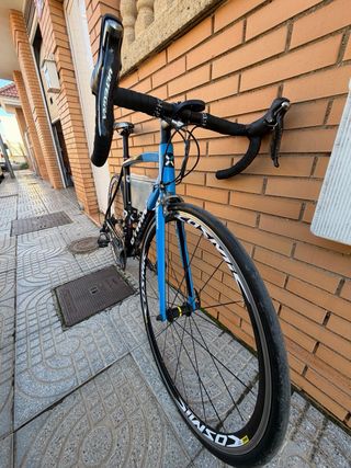 Bicicleta de carretera B'TWIN con cuadro de aluminio ultra ligero 6061 y horquilla de carbono. - Color azul y negro. - Ruedas Mavic Cosmic. - Manillar de carretera. - Grupo shimano ultegra completo (frenos, cambio, pedales). - Cubiertas Continental Gran Prix 5000.