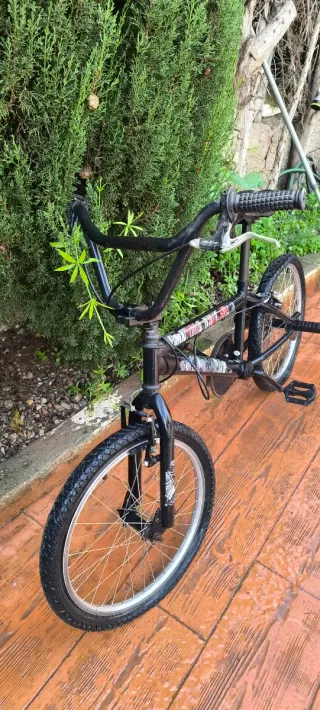 Bicicleta BMX en color negro, en excelente estado y casi sin uso. El único defecto que tiene la bici es que la rueda trasera está pinchada. - Cuadro de BMX. - Pedales negros. - Puños negros. - Sillín negro.