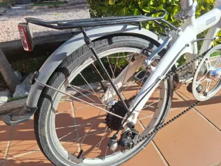 Bicicleta plegable de la marca Dahon, ideal para desplazamientos urbanos o para llevarla contigo a donde vayas. - Color blanco. - Ruedas de tamaño compacto. 20 pulgadas - Sillín ajustable. - Guardabarros delantero y trasero. - Pedales plegables. - Se pliega por tres sitios. - Lista para usar. - en muy buen estado de conservacion, tiene marcas de uso pero es una bici de mucha calidad. - 7 velocidades / marchas. .
