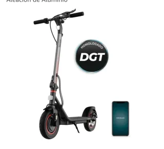 Patinete eléctrico con diseño moderno y homologado por la DGT. - Estructura de aluminio. - Ruedas con aro rojo. - Incluye pantalla de móvil con logo Cecotec.