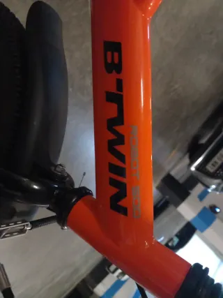 Bicicleta infantil Btwin de 14 pulgadas en color naranja. Ideal para los primeros pedaleos. - Prácticamente nueva - Ruedines de aprendizaje incluidos. - Sillín y manillar ajustables. - Guardabarros delantero y trasero.