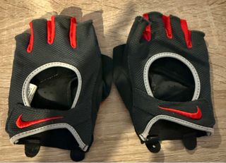 Guantes de ciclismo Nike sin dedos, diseñados para ofrecer comodidad y agarre. - Color negro con detalles en rojo. - Logo de Nike en rojo. - Aberturas para los dedos. - Cierre ajustable en la muñeca.