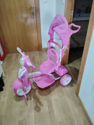 Triciclo infantil en color rosa, diseñado para las más pequeñas.funciona perfectamente, lleva música, pilas incluidas - Ruedas delanteras y traseras. - Asiento con respaldo. - Manillar con puños. - Barra de empuje para adultos.