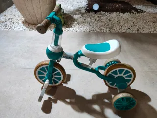 Bicicleta de aprendizaje y paseo para niños, con un diseño moderno y divertido. - Color verde azulado y blanco. - Asiento acolchado. - Ruedas de goma. - Manillar ajustable.