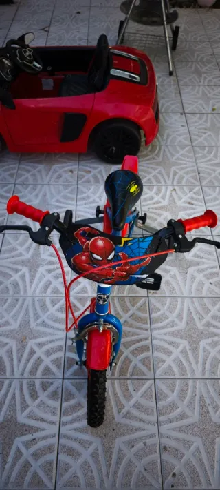 Se vende conjunto de bicicleta infantil y unicornio de peluche balancín. También se venden por separado. - Bicicleta infantil con diseño de Spiderman. - Unicornio de peluche rosa con cuerno y detalles. - Base de balancín de madera para el unicornio. Patinete eléctrico 180€ Coche rojo eléctrico 50€ Unicornio 15€ Bicicleta spiderman 70€ Todo 300