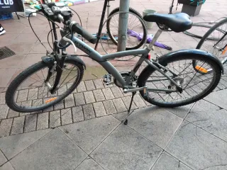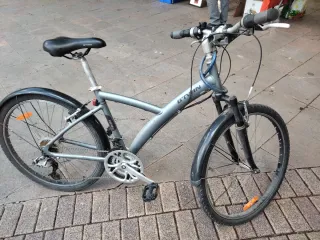 Bicicleta de paseo Btwin en color gris. Ideal para desplazamientos urbanos. - Cuadro de aluminio. - Ruedas de 26 pulgadas. - Frenos V-brake. - Cambio Shimano. - Guardabarros delantero y trasero.