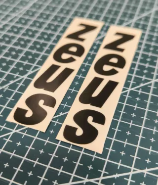 Vendo kit de pegatinas "Zeus" para la horquilla de la bicicleta. El kit está compuesto de 2 pegatinas iguales, a elegir entre: - Letras negras, fondo transparente - Letras blancas, fondo transparente - Letras negras, fondo blanco ovalado Posibilidad de envío por correo ordinario + 1,5€
