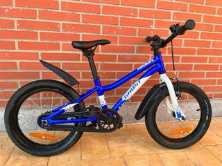 -Bicicleta infantil Ghost Powerkids de 16 pulgadas, ideal para los más pequeños, niños de 4 a 6/7años. -Diseño en azul y blanco, poco uso. -Mecánicamente está nueva y estéticamente las marcas normales de uso, si se amplía la foto se ven. -Se incluyen ruedines sin estrenar. -Se vende por cambiar de talla. -Tiene freno de maneta y freno con los pedales para mayor comodidad. -Es una bicicleta muy indicada para esas edades, cómoda, ligera (9.5 kg) y además muy chula. #bicicletaniño #biciinfantil #bicicletapequeña