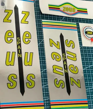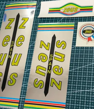 Vendo kit de pegatinas Zeus. Según la rotulación que se necesite, el Kit incluye: - 1 pegatina Zeus rectangular tubo vertical. - 1 pegatina Zeus rectangular tubo diagonal. - 2 pegatinas Zeus Superser fondo rojo. - 1 pegatina Zeus Serie Exportación (fondo marrón o cromado). - 1 pegatina Zeus Equipo original accesorios. - 1 pegatina "Criterium 78" fondo transparente. - 1 pegatina logo frontal redondo u ovalado. - 2 pegatinas Zeus para horquilla, negras sobre fondo ovalado blanco, o negras fondo transparente, o blancas fondo transparente. - 2 pegatinas triangulares y una rectangular "Reynolds 531". - 6 remates para acabado de pintura.