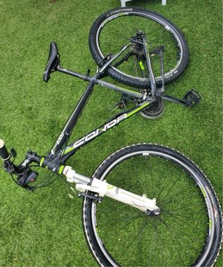 Bicicleta de montaña Decathlon con ruedas de 27.5 pulgadas. - Cuadro de aluminio. - Frenos de disco. - Suspensión delantera. - Cambio Shimano.
