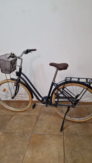 Bicicleta urbana de color azul, ideal para desplazamientos diarios. - Cesta delantera. - Portabultos trasero. - Ruedas de 28 pulgadas. - Sillín marrón. - Guardabarros. Se vende por no usarse, solo ha sido utilizada dos veces por ciudad