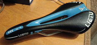 Sillín de bicicleta de la marca Lietu en color negro con detalles en azul. - Diseño ergonómico. - Canal central. - Acolchado medio. - Materiales de calidad. - Logotipo de la marca visible. - 135 mm ancho. Valido para MTB o carretera. Tiene solo un pequeño roce que se aprecia en la foto.