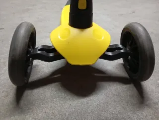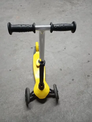 Patinete de tres ruedas en color amarillo, diseñado para niños. Cuenta con un manillar ajustable para adaptarse a la altura del usuario. - Tres ruedas para mayor estabilidad. - Manillar con empuñaduras negras. - Plataforma de color amarillo.