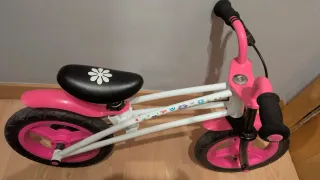 Bicicleta de aprendizaje en color rosa, ideal para los más pequeños. - Marco blanco con decoraciones de flores. - Ruedas de 12 pulgadas. - Sillín negro con detalle de flor blanca. - Puños negros y rosas en el manillar.