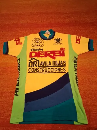 Maillot de ciclismo vintage del equipo DERBI. Talla 3 como una m De axila a axila 44cms De arriba a abajo 62cms Monver - Diseño retro con colores vibrantes. - Tejido cómodo para el deporte. - Logos del equipo y patrocinadores visibles.