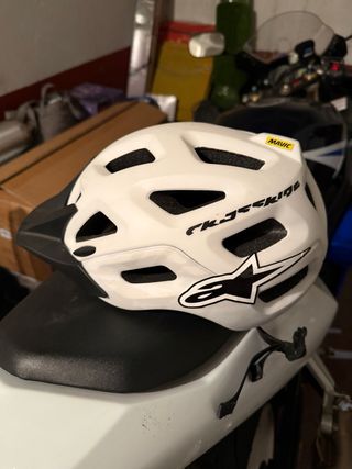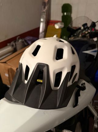 Casco de montaña Mavic en talla L. Diseñado para ofrecer protección y comodidad en tus rutas. - Color blanco con detalles negros. - Visera integrada. - Logo de Mavic en la parte trasera. - Diseño con ventilación.