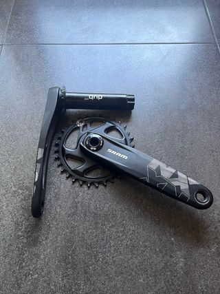 Bielas Sram NX DUB Wide de 175mm. - Color negro. - Diseño moderno con detalles gráficos. Peso total 648gr. Plato 32t con 3mm offset. Bielas de 175mm. Wide 3 tornillos