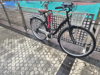 Bicicleta de paseo en color negro, ideal para desplazamientos urbanos. - Cesta delantera de metal. - Sillín marrón. - Guardabarros delantero y trasero. El sillin no se puede mover
