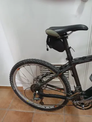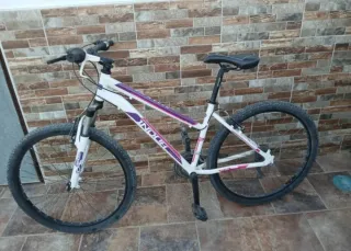 Bicicleta de montaña con doble suspensión, ideal para terrenos irregulares. Su diseño permite una conducción cómoda y estable. - Cuadro de aluminio. - Frenos de disco. - Ruedas de 26 pulgadas. Irregularidades: Orquillas a reparar