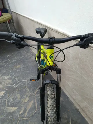 Bicicleta de montaña de color amarillo brillante, lista para tus aventuras. - Cuadro de aluminio. - Ruedas de 27'5 pulgadas. - Frenos de disco. - Suspensión delantera.