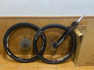 Conjunto de ruedas de 29 pulgadas y horquilla RockShox. - Rueda delantera con horquilla RockShox. - Rueda trasera con cassette. - Neumáticos Maxxis Ikon. -piñonera 12 velocidades